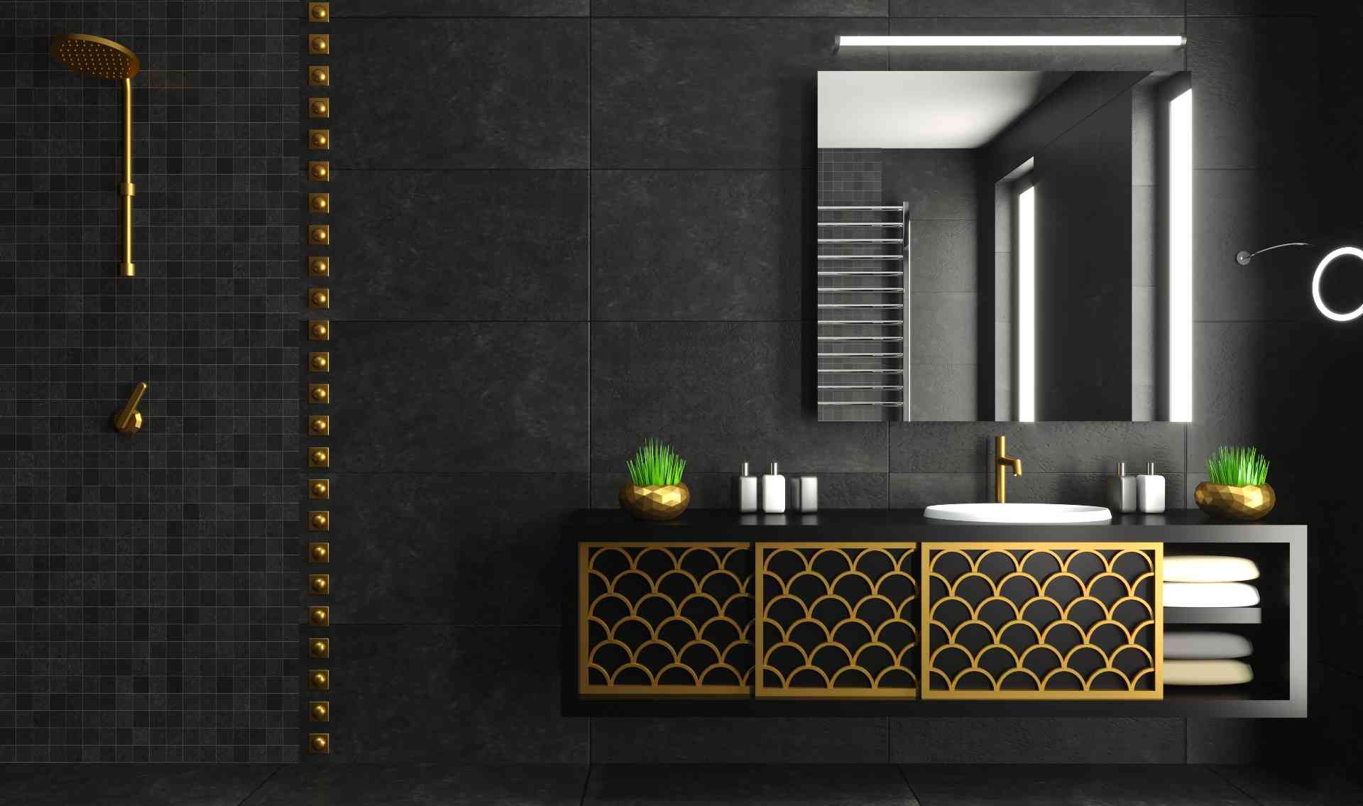 This bathroom pairs deep black tiles with rich gold details for a luxurious, high-impact look. Matte black large-format tiles create a dramatic backdrop, while gold fixtures, trim, and vanity accents add warmth and glamour. Small black mosaics in the shower bring texture that helps the gold elements stand out even more.