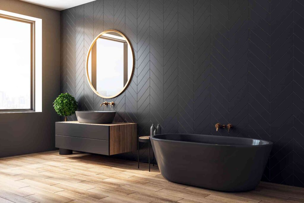 This bathroom pairs a sleek black chevron tile wall with warm wood-look flooring for a balanced, modern retreat. The chevron pattern adds movement and texture, while the matte black finish keeps the design sophisticated and calm. The warm wood floor softens the bold wall and connects beautifully with the natural wood vanity for a cohesive, welcoming look.