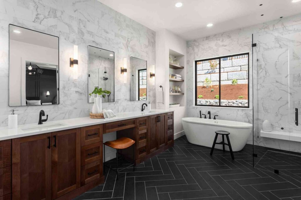 This bathroom uses a black herringbone tile floor to ground an otherwise bright, airy space filled with white marble and soft natural light. The dark flooring adds interest and depth, giving the warm wood cabinetry and matte black fixtures more definition, while the herringbone pattern introduces subtle movement that balances the smooth, clean surfaces.