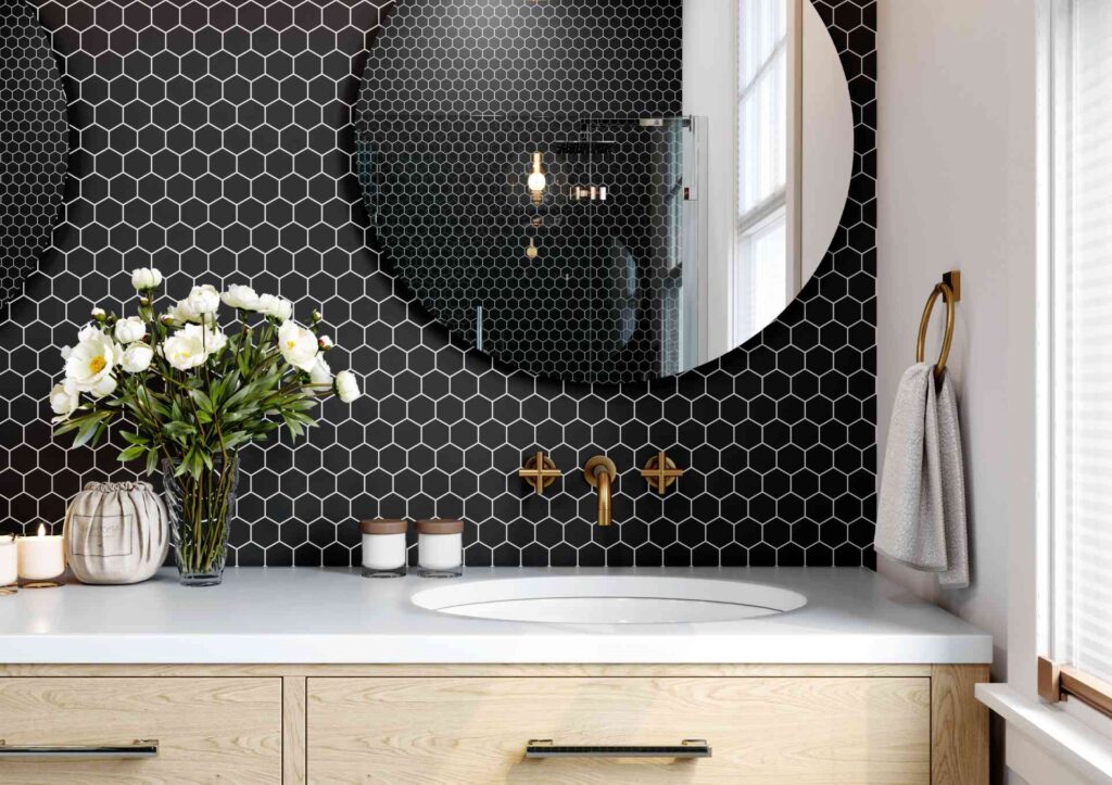 To recreate this look, use matte black hexagon tiles with bright white grout for strong definition, add brass hardware for warmth and contrast, and finish with natural wood cabinetry and simple round mirrors for a contemporary, inviting feel.
