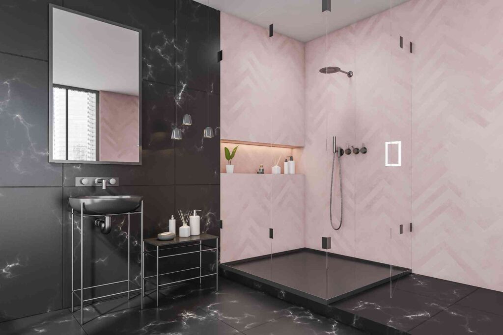 To recreate this look, use black marble or marble-look porcelain on the floor and one feature wall for a bold foundation, then add soft rose tile in a subtle pattern for warmth and texture. Keep fixtures minimal and choose matte black or brushed nickel hardware so the refined color combination stays at the forefront.