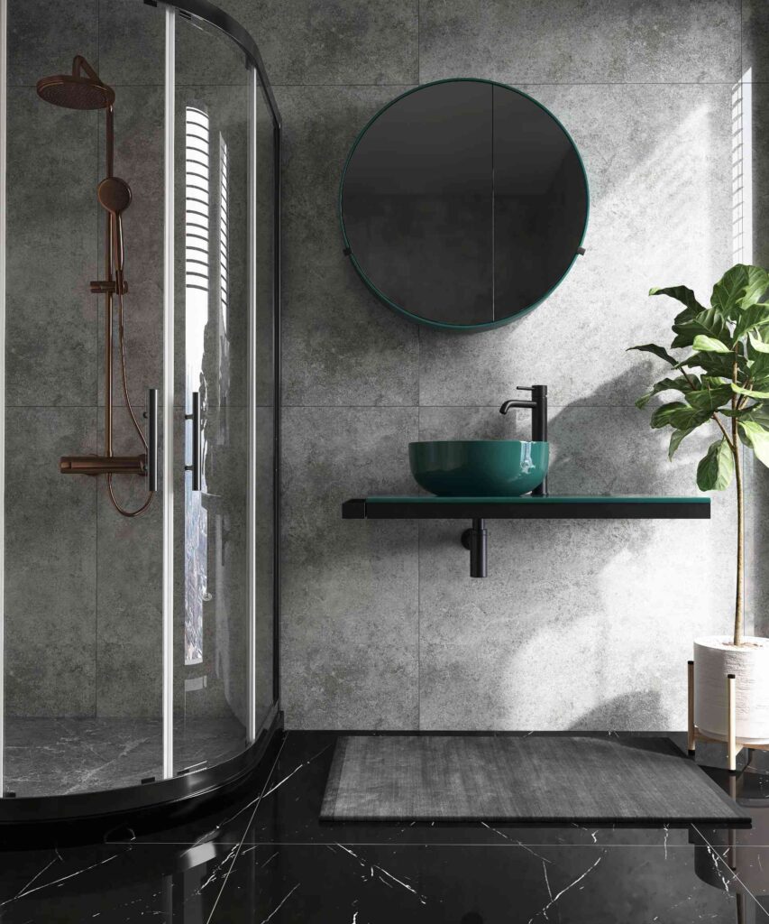 This bathroom blends dramatic black marble flooring with soft gray concrete-look walls for a modern, layered effect. The black floor adds depth and elegance by reflecting light, while the muted gray walls balance the darkness and keep the space feeling open. Deep green accents in the vessel sink and mirror frame introduce a rich pop of color that enhances the natural elements without overwhelming the design.