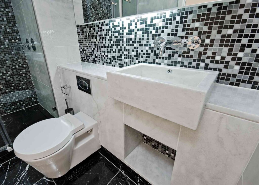 To recreate this look, install a mixed-tone mosaic as an accent behind the vanity or in the shower using ceramic or glass tile, pair it with polished black floor tiles for strong contrast, and keep the surrounding walls in light stone or marble so the mosaic remains the centerpiece.
