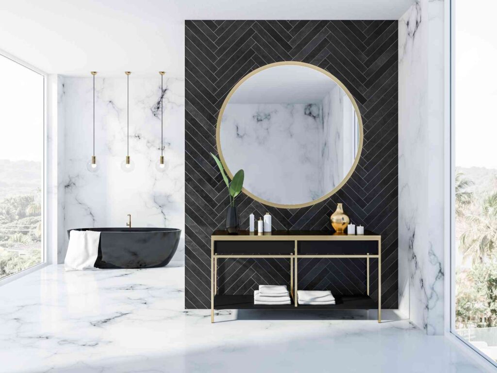This bathroom centers around a bold black tile wall that stands out against expansive white marble, creating a dramatic architectural focal point. The deep matte black anchors the room and draws attention to the vanity and oversized circular mirror, while the surrounding marble acts as a neutral backdrop that makes the dark wall feel sculptural and intentional.