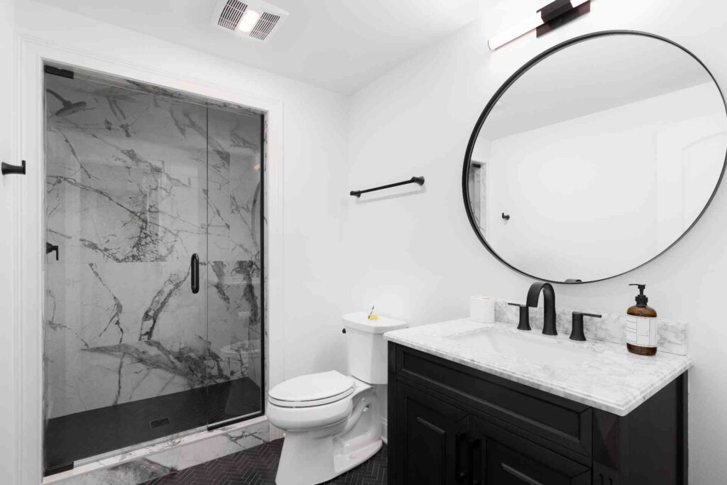 18. Black and White Bathroom with Marble Shower